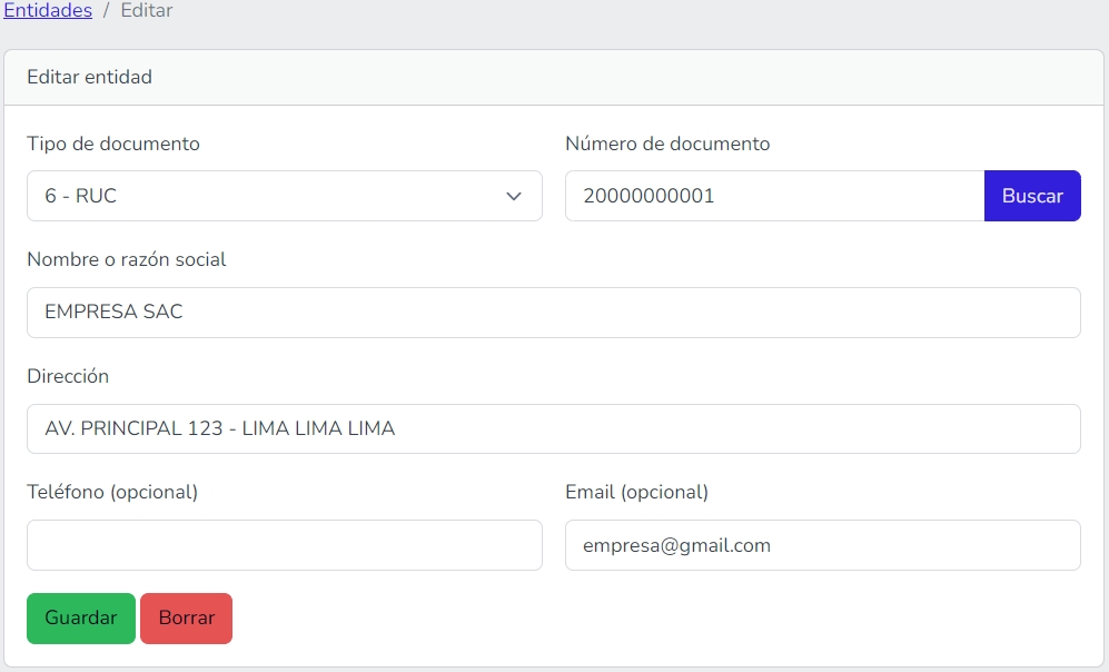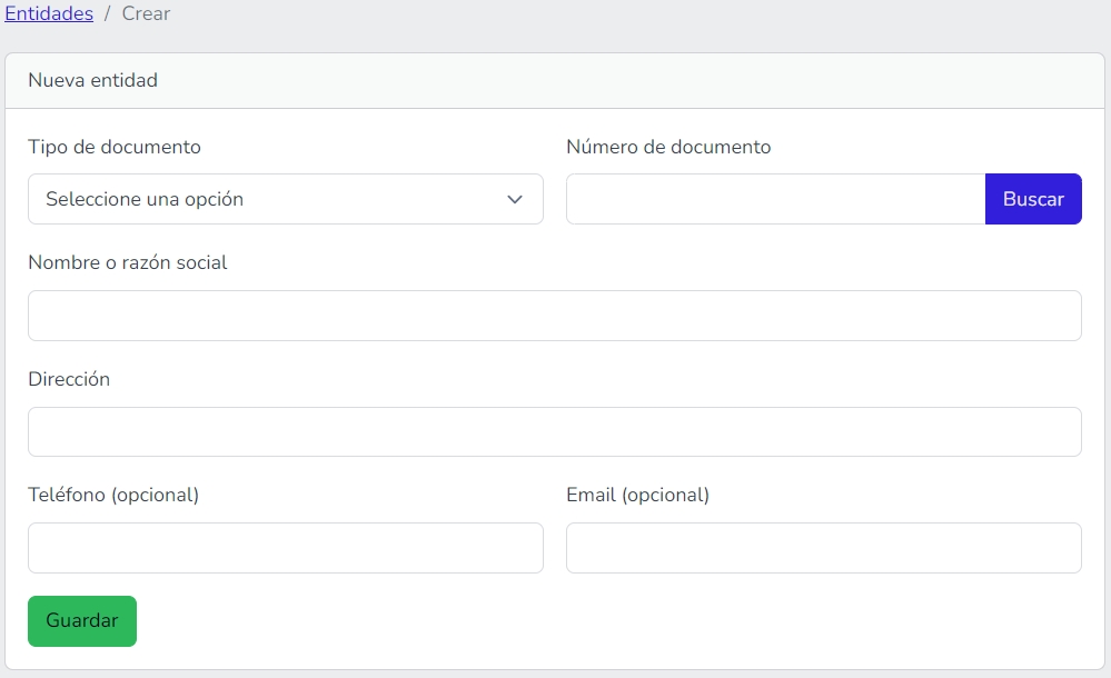 Debe completar todos los campos no opcionales. Si tiene una API de consulta activa debe seleccionar el tipo de documento, ingresar el número de documento y luego hacer clic en el botón Buscar