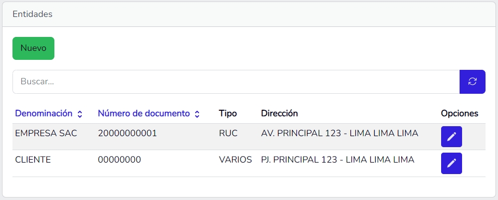 Puede buscar y filtrar entidades por denominación (nombre o razón social) y número de documento (RUC o DNI).
